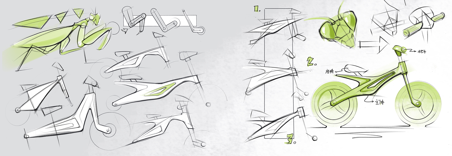 以仿生螳螂为灵感的儿童滑步车概念方案,围绕“轻便、安全、舒适”建立 CMF 语言与可制造的落地细节。